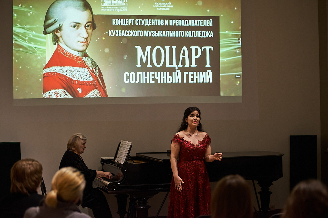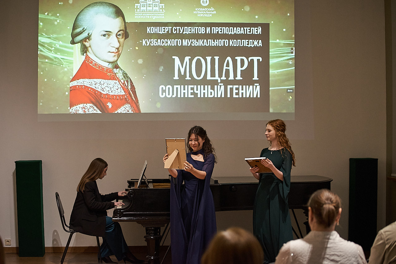 Торжественный концерт «Моцарт. Солнечный гений», приуроченный к юбилею великого композитора, состоялся в Музее изобразительных искусств Кузбасса. В исполнении студентов и преподавателей Кузбасского музыкального колледжа прозвучали яркие и жизнерадостные произведения Вольфганга Амадея Моцарта. Гости мероприятия услышали изящные и элегантные мелодии, исполненные на фортепиано, гобое, виолончели с участием вокала.