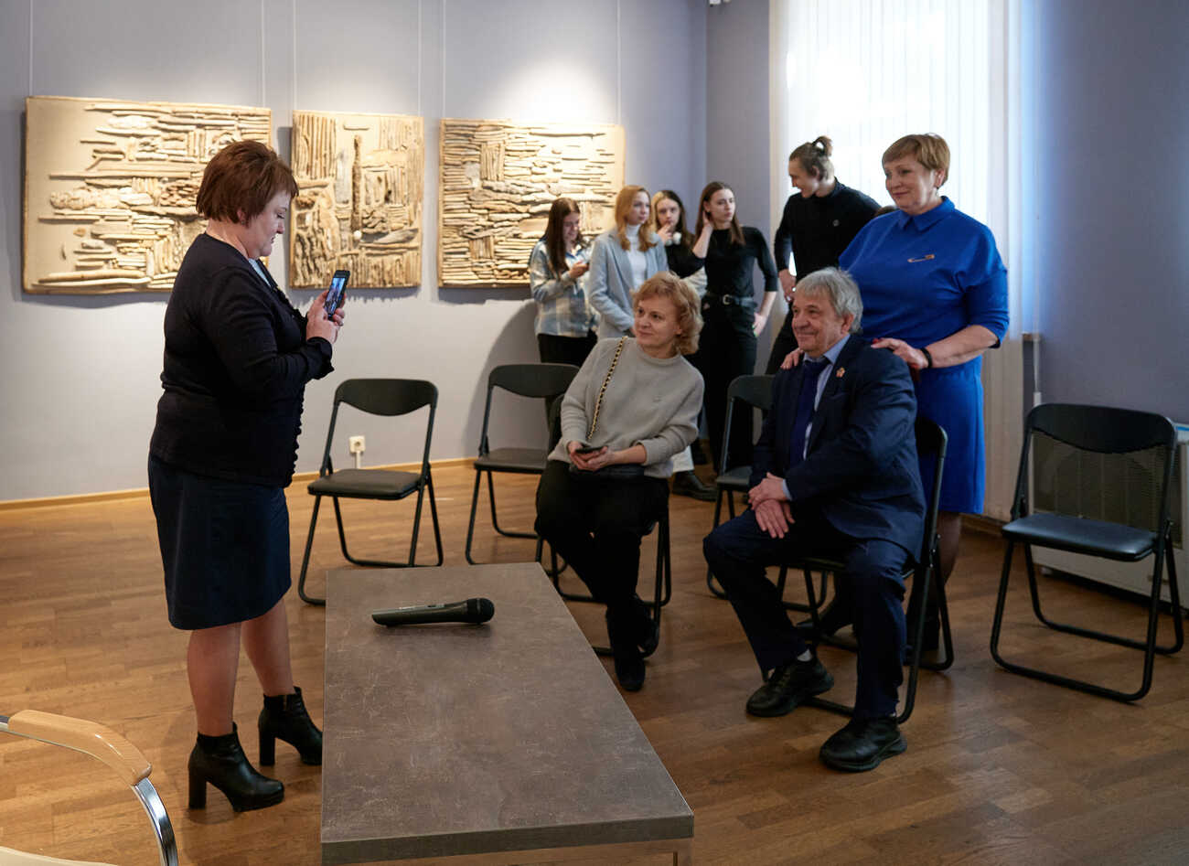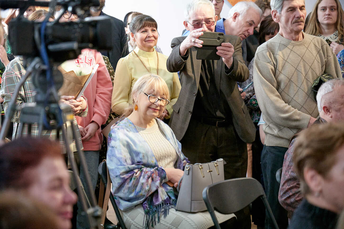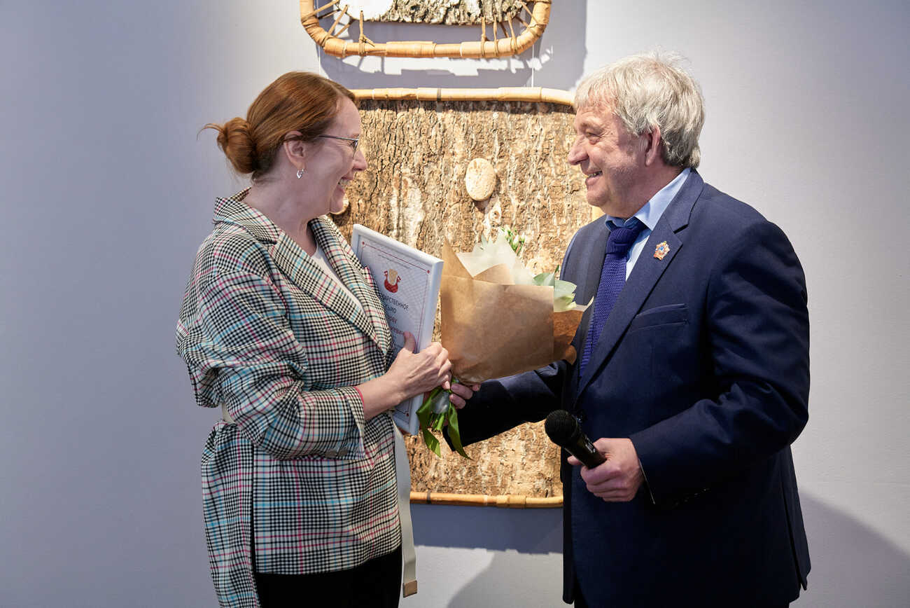 С открытием выставки Олега Дмитриевича поздравили и вручили благодарственные письма председатель комитета по вопросам образования, культуры и национальной политики Парламента Кузбасса – И.Ф. Федорова, исполняющая обязанности министра культуры и национальной политики Кузбасса – Ю.Л. Тихонова. Слова поздравления в адрес художника были сказаны исполняющей обязанности заместителя главы города Прокопьевска по социальным вопросам – О.В. Сергеевой, директором центра народного творчества Кузбасса – Н.В. Орловой. Душевной песней прозвучало поздравление патриарха художественной бересты Кузбасса – Ю.М. Михайлова (г. Мариинск).